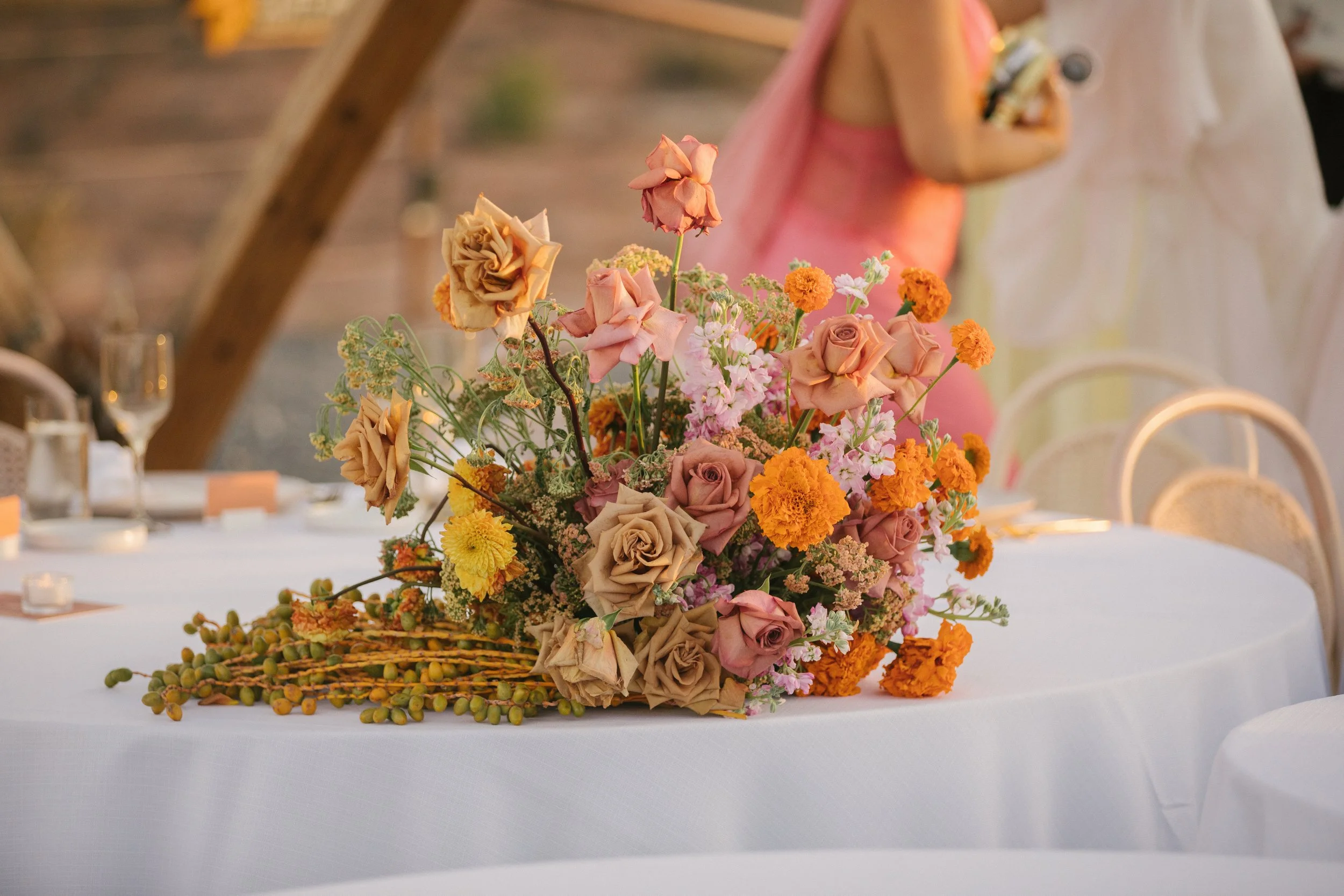 Three Swords Floral Co requires a minimum of $50k to provide our floral services here. The desert is a harsh environment for flowers. It is no small feat to put on a production in the desert, and requiring a higher investment helps ensure enough hands on deck to provide top notch design labor with ample flowers, and replacements for any flowers damaged from braving the elements.